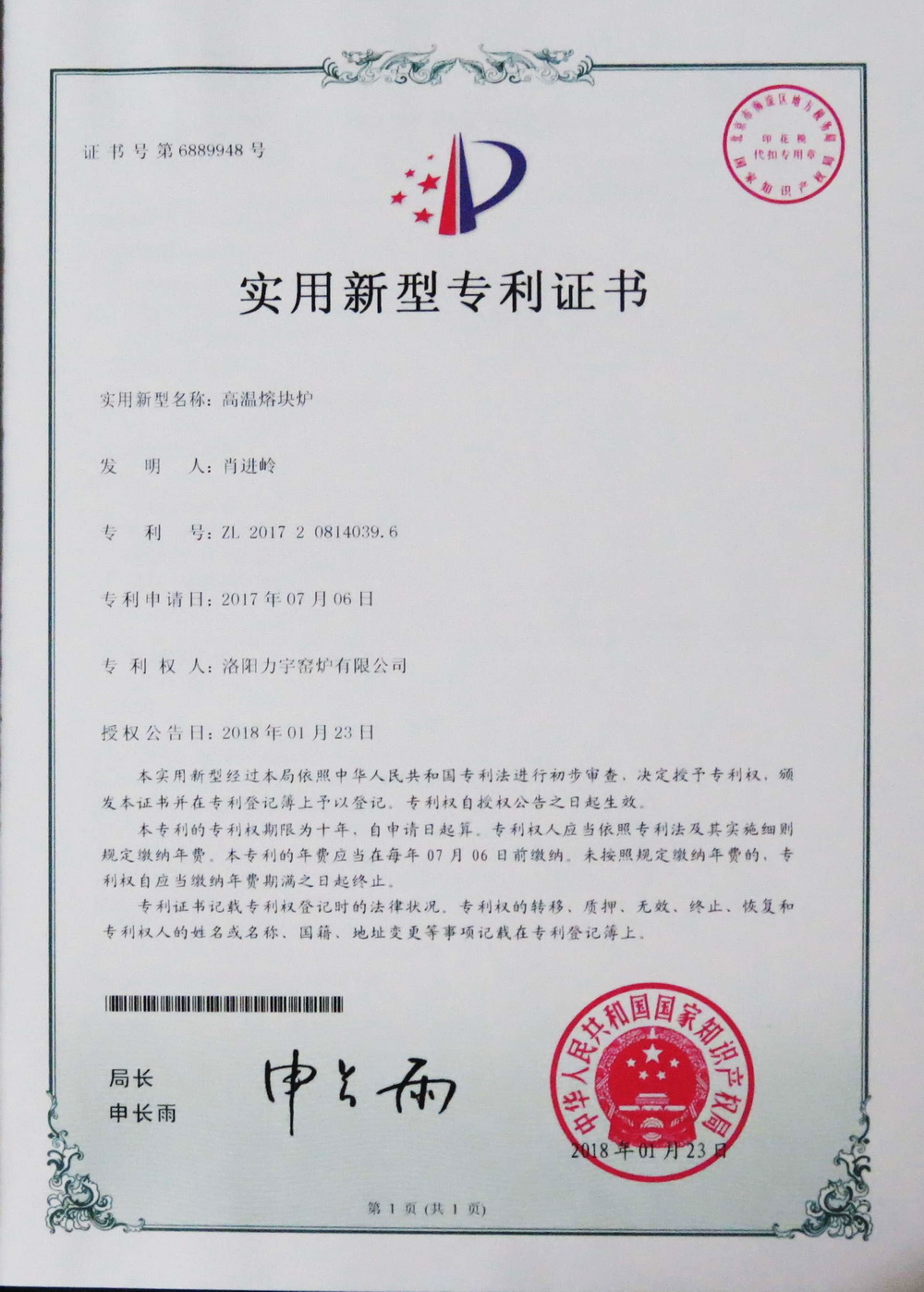 安全型高溫熔塊爐實(shí)用新型專 利證書